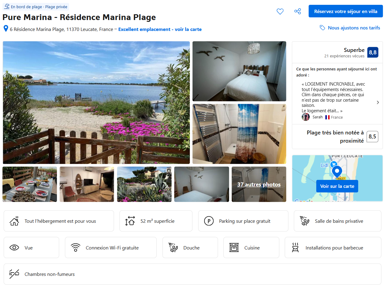 Il faut compter seulement quelques minutes de plus pour rejoindre la grande plage, l’installation de ski nautique, kneeboard, wakeboard et le parc aquatique, ainsi que des commodités pratiques comme Lidl, la station-service ou encore le marché (dimanche et mercredi) dans le centre-ville et au port, où se trouvent également de nombreuses autres boutiques. Pour les escapades un peu plus lointaines, Perpignan et Narbonne se trouvent à 20 minutes en voiture, Carcassonne et Figueres (Espagne) à 1 heure, Toulouse et Montpellier à 2 heures et Barcelone à 2h20.
